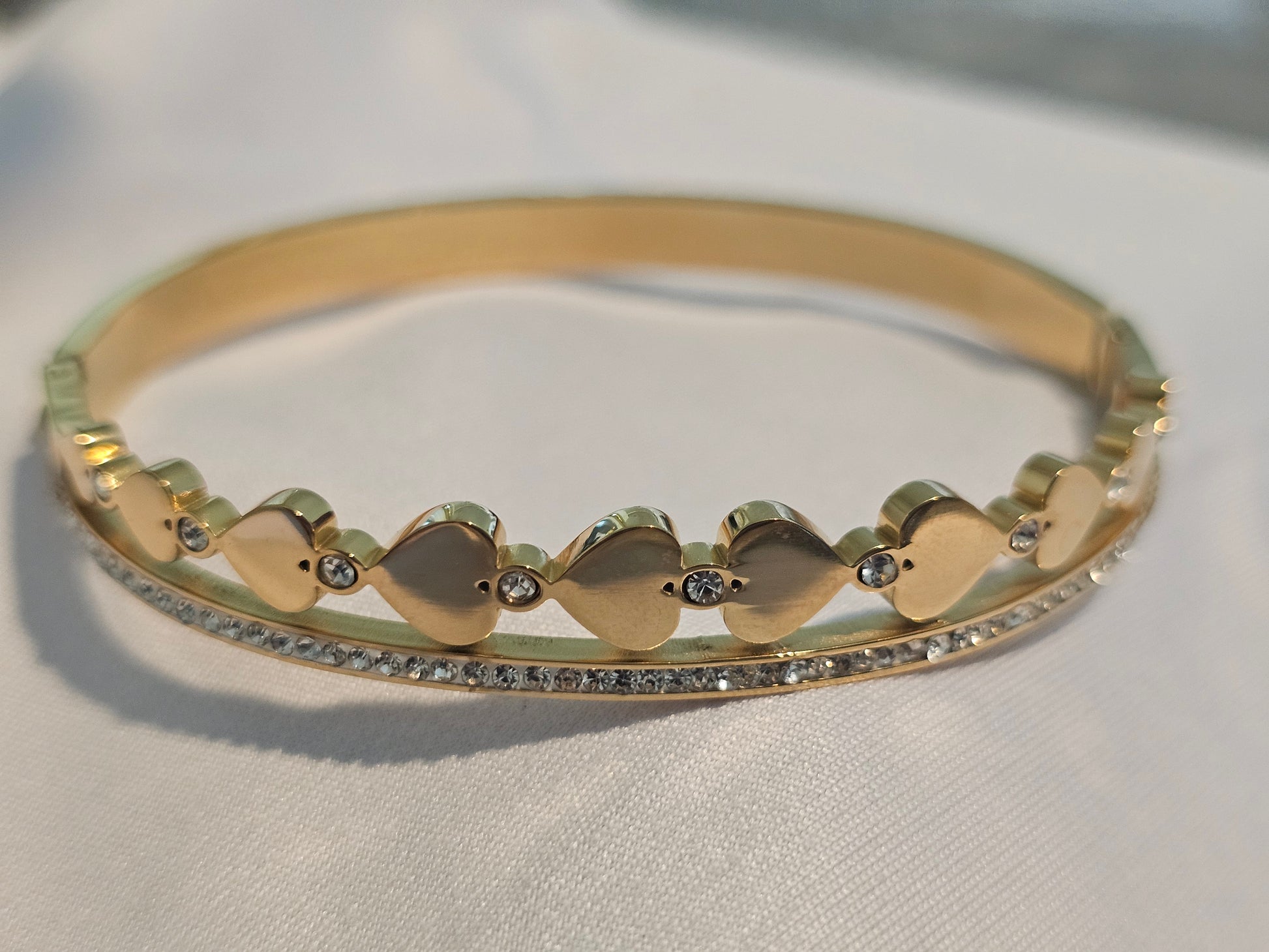 18k Gold Plated titanium steel heart bangles with sparkle. Tarnishing-free and waterproof 60mmUpgrade your accessory game with our 18k Gold Plated heart bangles, featuring a sparkling design that will catch everyone's eye. Crafted from high-quality stainless steel, these bangles are tarnish-free and waterproof, ensuring long-lasting wear. Add a touch of luxury and elegance to any outfit with these 60mm bangles.