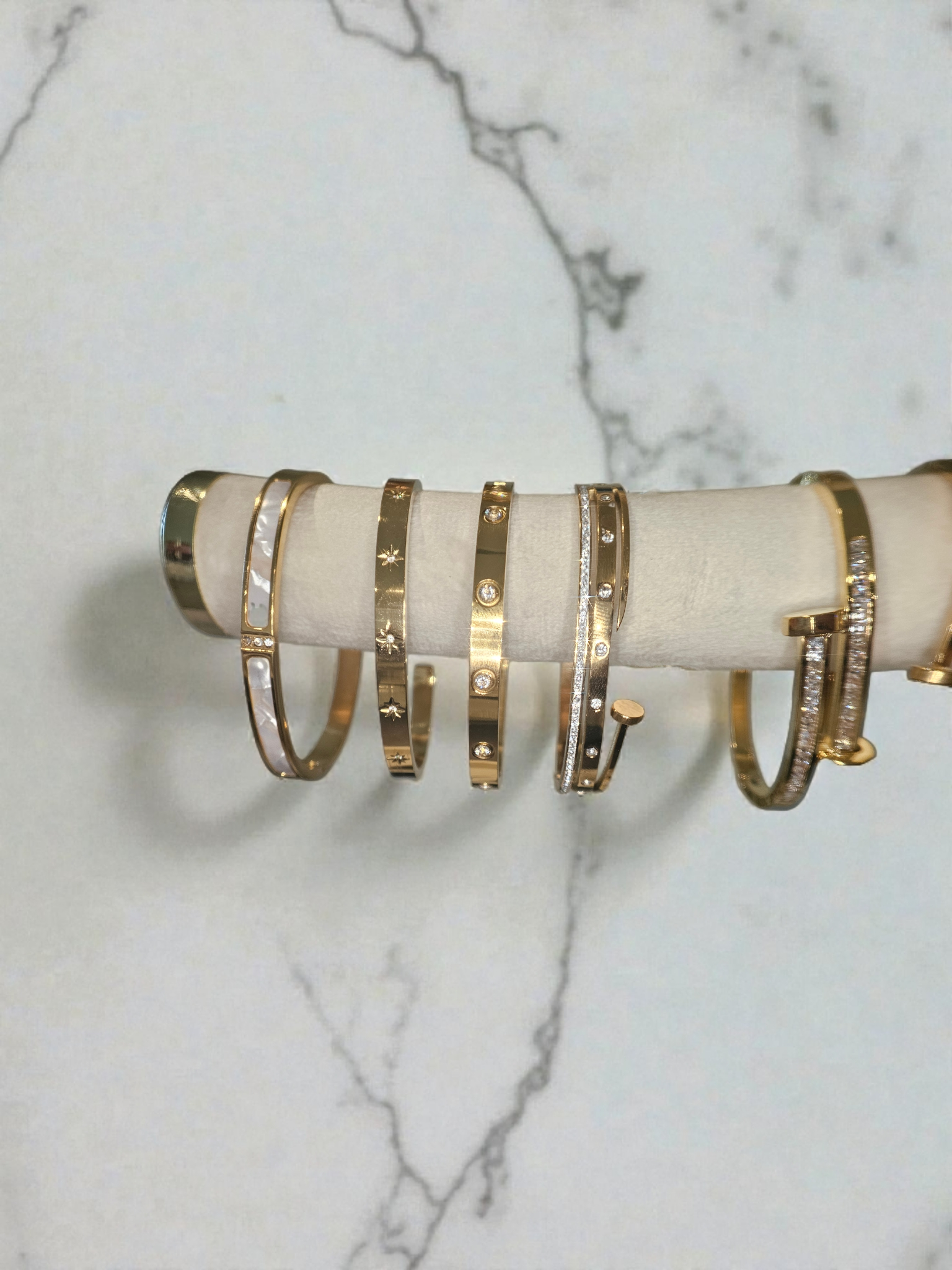 Elevate your accessory game with our 18k Gold Plated marble look bangles. Crafted with tarnish-free and waterproof materials, these bangles are perfect for any occasion. With a non-fading titanium finish and a versatile 60mm size, you'll never have to worry about making a statement.